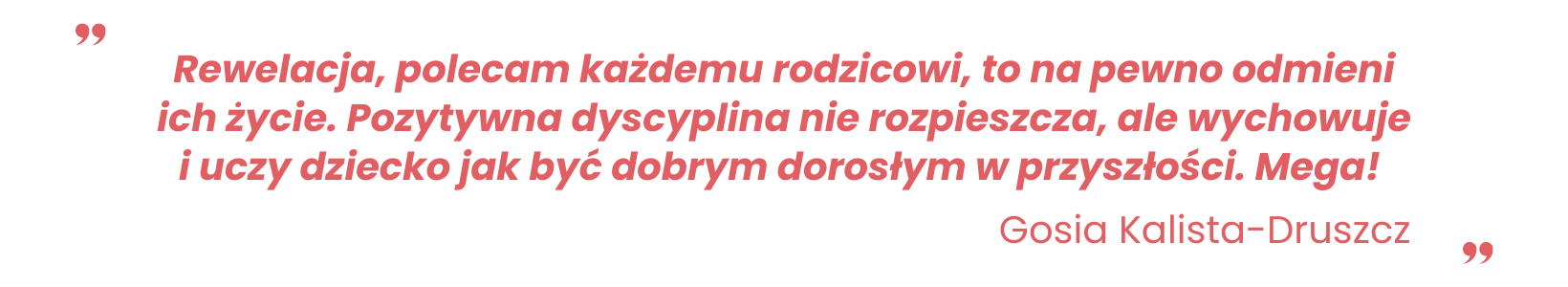 Jeśli szukasz czegoś, co pomoże w tym, by rodzicielstwo dawało ci satysfakcję, by dom rodzinny był miejscem, w którym chce się być, a wychowanie dzieci było przygodą i towarzyszeniem, to Pozytywna Dyscyplina jest właśnie tym. Zamiast suchej książkowej wiedzy otrzymałam słowa zachęty, wsparcia, wciągający tok wypowiedzi oraz konkretne przykłady. Poczułam w sobie siłę i energię do zmiany, szczególnie do innego patrzenia na proces wychowania: nie jako cel do zrealizowania na liście zadań, ale jako towarzyszenie w drodze do dojrzałości, w atmosferze miłości. Konkretna zmiana: nie staram się rozwiązać problemu od razu, kiedy któreś z nas jest zmęczone, zdenerwowane lub w innej silnej nieprzyjemnej emocji.