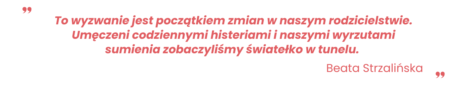 […] najważniejsze dla mnie jest poczucie, że to ja mogę kształtować swoje życie. To ode mnie zależy, czy załamię się popełnionymi błędami, czy też zmotywują mnie one do pracy. Kwestia rodzicielstwa to jedna sprawa, ale zarządzanie emocjami, w tym gniewem, dotyczy każdego aspektu naszego życia. Myślę, że choćby próbując się z tym zmierzyć i starać się o najmniejszą zmianę, już osiągamy bardzo dużo, czego często nie zauważamy.